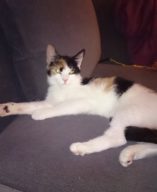 hun er ca 10mnd gammel,trikolor i fargene som er svart,hvit og brun. Hun har også en liten svart prikk over høyre øye og hvit på alle labbene,den ene baklabben har hun en svart flekk på .hun er høy og tynn.