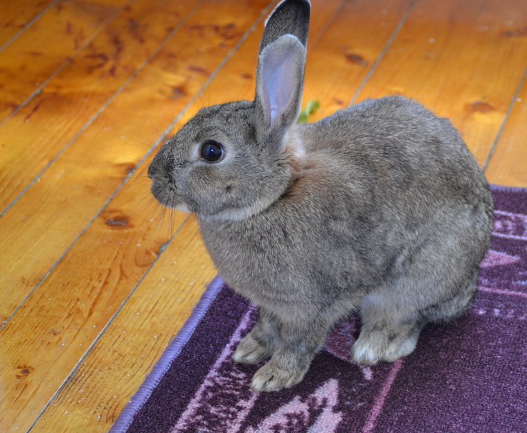 Viltgrå slank kanin. Hareaktig utseende og kroppstype. Muligens Belgisk Hare-mix. Anslagsvis mellom 1,7 og 2kg.