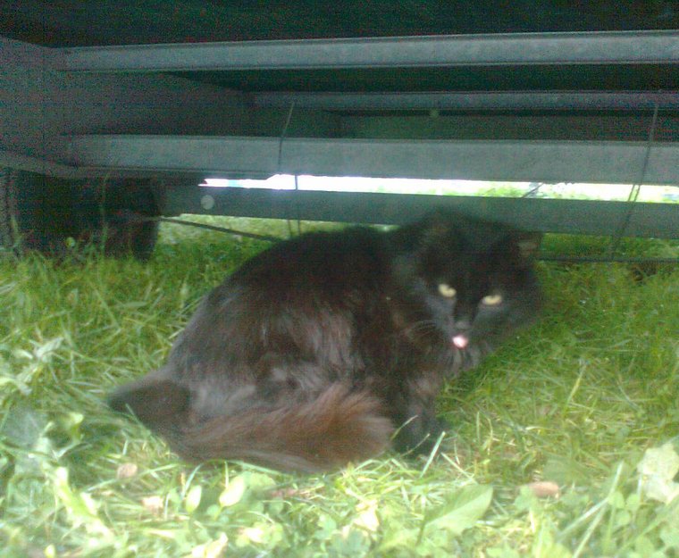 Katten holder til bak hovedbygningen under noen arbeidsbrakker. Ukjent hvor lenge den har vært der, men trolig ei ukes tid.