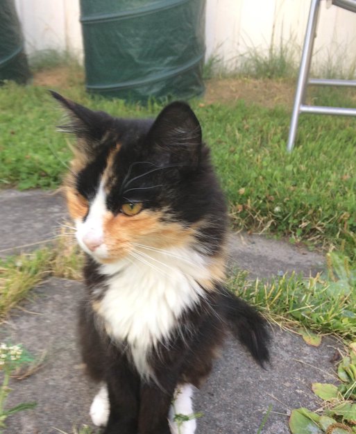 Katten er tynn. Veldig kosete og tillitsfull. Maler og mjauer mye med ganske spe mjauing. Sort stripe ned ved høyre øye men ikke på venstre side. Hvite "sokker" på potene.