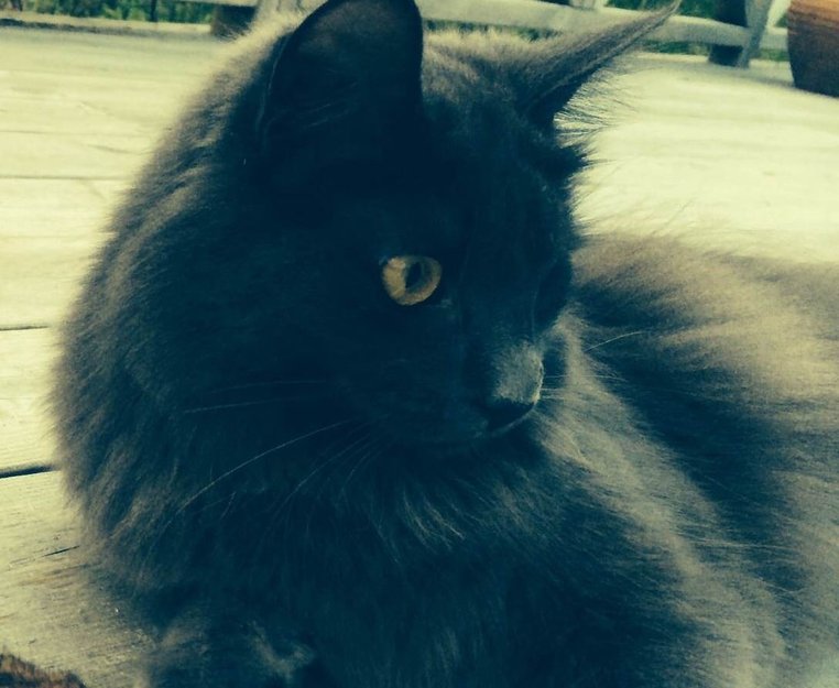 Nemi er en slank ID-merket hunnkatt, helt grå med noen hvite hår på ryggen/siden. Hun har gule øyne.