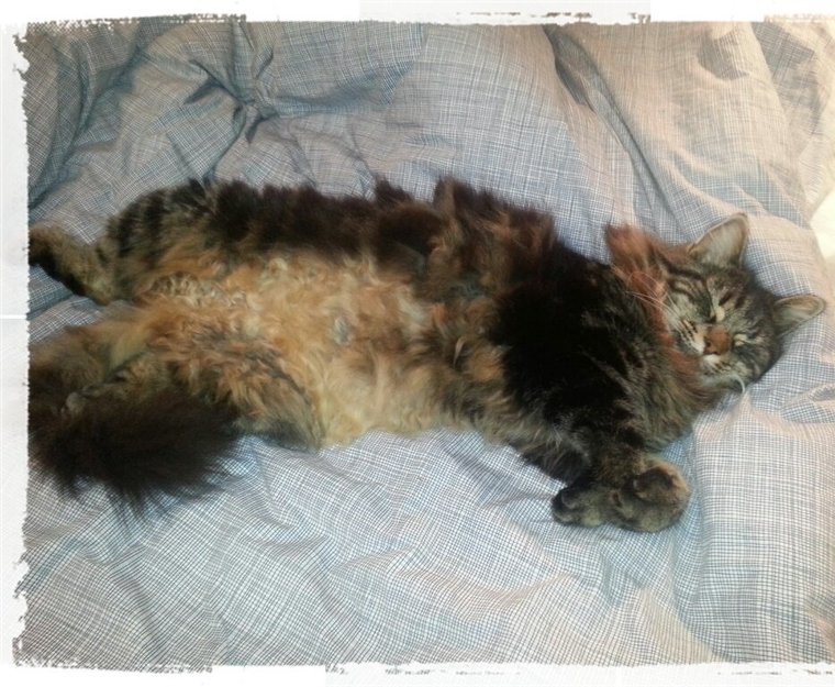 Langhåret, svart fra hodet og til halen med flere farger, striper i pelsen. Hun er lys på magen og hvit under haken.