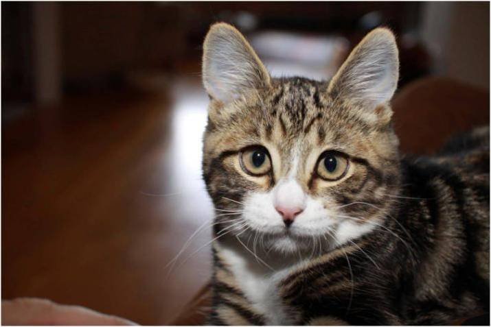Michael er haleløs, hvite labber og hvitt bryst og snutepari ellers tigerstripet, Veldig sosial og leken.