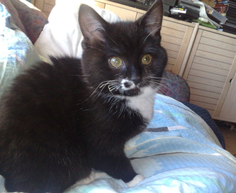 Gunnis er svart og hvit med en liten svart prikk mitt i det hvite hun har i nedre del av fjeset. Hun er 4 år men hun er en dvergkatt så hun ser ikke ut som hun er mer enn 8 måneder gammel.