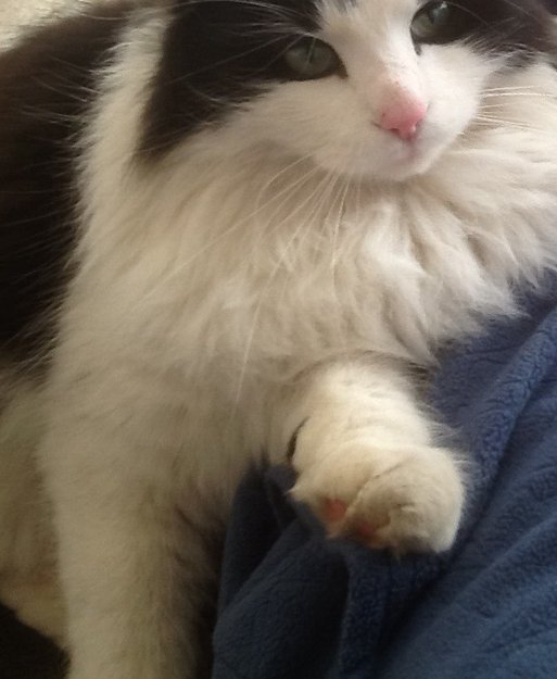 Ung katt, hvit over nese og munn og litt opp i pannen, helsvart resten av hodet. Hun har en svart flekk bak på venstre framfot og bak på høyre bakfot. Svart over ryggen og halen, hvit på føttene og magen, hvit på brystet og har en hvit krage som går bak mot nakken.