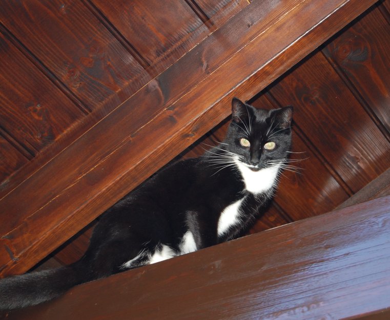 Liten hunkatt med sort og hvit pels. Hvite poter, mave og bryst og en liten hvit stripe under snuten.