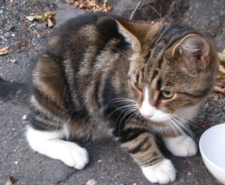 Katten tok kontakt da jeg skulle mate en annen katt. Virket sulten og veldig interessert i maten og kos. Mulig den har vært i området lenger, men tok kontakt 23/7.