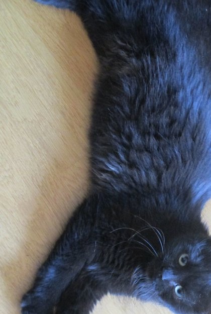 Ung frøken ca 6 -10 mnd. Var veldig sulten og kontaktsøkende. Og kjempekosete. Hun er langhåret,sort/mørk brun i pelsen og med en liten hvit flekk på halsen. Har også fått litt hvit maling i pelsen. Hun er ikke chippet.