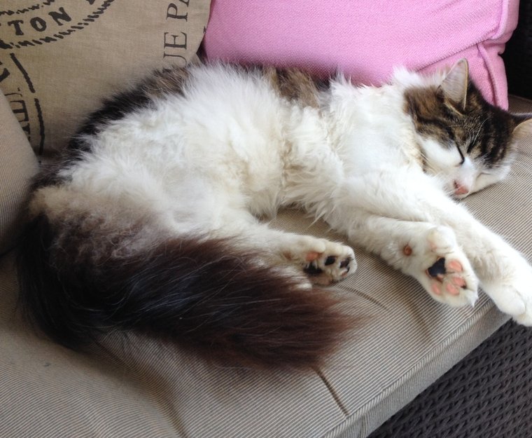 Han er en skipskatt, mørke farger på ryggen og helt hvit på magen.