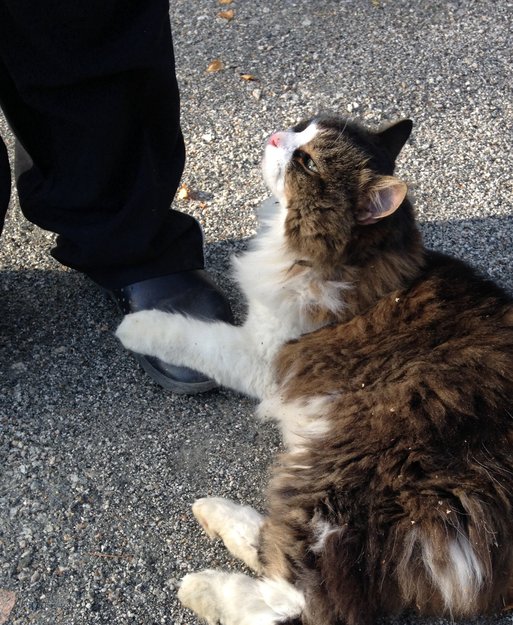 Langhåret mye pels, store hvite poter, har en sort flekk på venstre fremfot. Veldig kjælen og er tydelig vandt til børsting,løfting og håndtering. Mjauer og er pratsom
