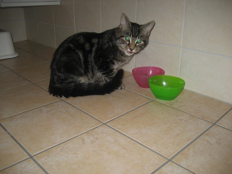Han kom i full fart inn til oss den 06.11.09 og rett til matkoppene. spiste opp hele matskålen med mat og drakk opp skålen med vann. Han er veldig sosial og kosete. sover mye og nekter å gå ut;)