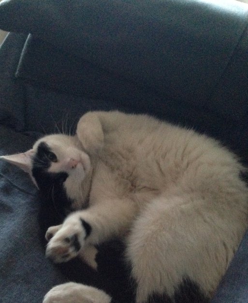 Han har tegning som om panneluggen er skjev. Han har sort hale og hvite ører, hvite kjaker og hvitt rundt munnen. Hvit på ryggen med sort tegning. Han er meget meget sky da han er en hittekatt fra Dyrebeskyttelsen som er tatt i pensjon av meg.