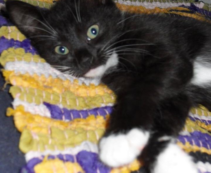 Svart, med hvite poter, hake og bryst. Gammelt bilde, så hun er endel større enn bildet viser. Har mistet halsbånd, men har et grønt flåtthalsbånd på seg.