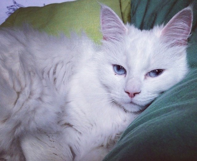 Hun har blå øyne, hvor pupillen på det høyre har vært "utflytende" siden hun kom til oss.