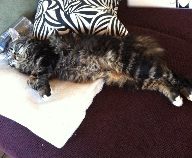 Brunstripete lang pels, med hvite poter og hvit haletipp. Veldig sosial og pratsom, men mulig skremt grunnet uvær og påkjørselen.
