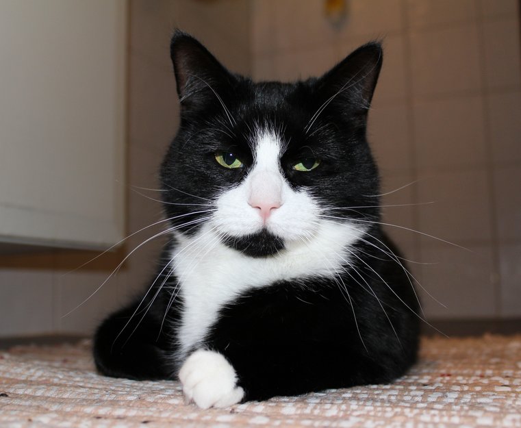 Relativt liten hunnkatt, sterilisert, hvite poter, svart og hvit farget pels. Litt nervøs for ukjente mennesker i begynnelsen, men kommer etterhvert når hun føler seg trygg. Tillitsfull.