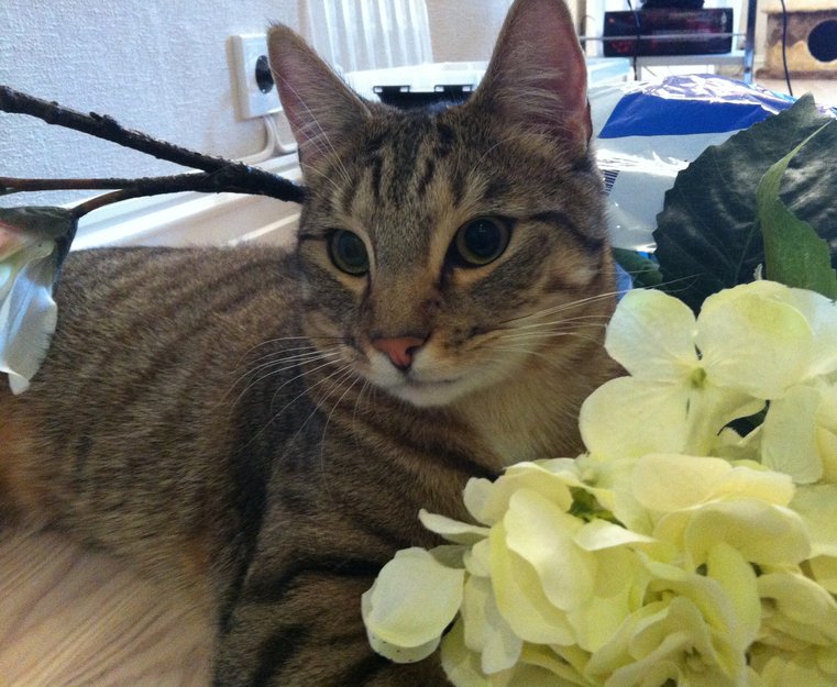 Han har antagelig sklidd fra verandaen (pga regn), og blitt redd og løpt inn i skogen. Han er en innekatt, så han er ikke vant til å være ute uten eier. Det har regna og tordnet mye siden han forsvant, så jeg er tror han har blitt skremt og gjemmer seg et sted.