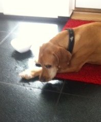 Lysebrun med hvite poter og hvitt bless på brystet.