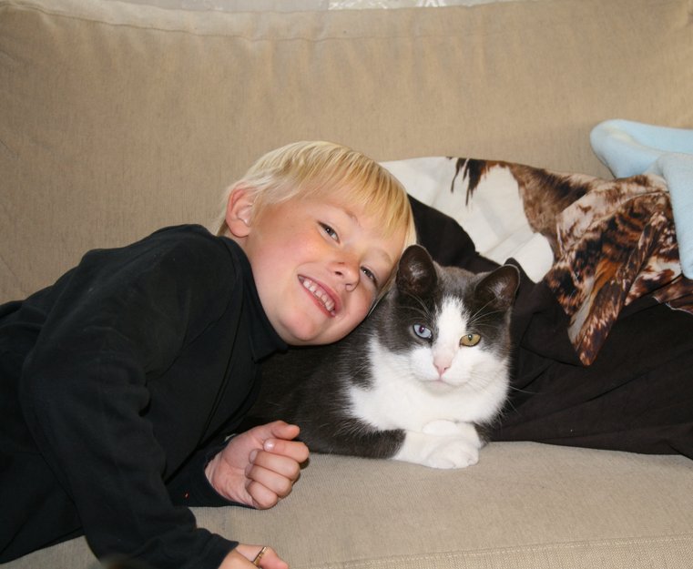 Fernando kom heldigvis hjem på egenhånd, litt sliten og sulten. Han ble tatt med til veterinær, og går nå på antibiotika og får smertestillende for bittet på foten. Men jeg håper alle katteeiere kunne begynne å ta ansvar for kattene sine og kastrere dem, for han hadde ikke blitt angrepet dersom den katten som lusker rundt her hadde vært kastrert. Og det er ikke en katt som blir brukt til avl. Men vi har noen veldig lykkelige barn her (og en hund som er superglade for å få verdens snilleste katt hjem igjen :-)
