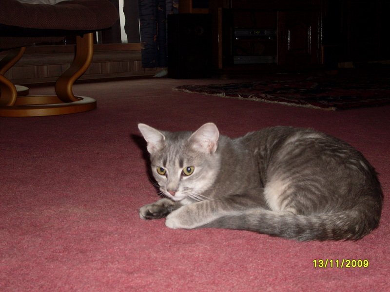 Koksgrå med striper i sort/mørkegrått. Hadde halsbånd, men uten navn.