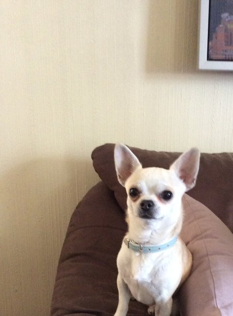Har funnet en lysebrun og hvit chihuahua gutt , den har blått halsbånd og har oppstående ører , har gitt den mat og vann og har den hos meg til eieren dukker opp:-)