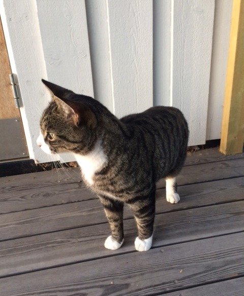 Katten har vært rundt huset vårt i 3-4 dager og virker sulten, men er ellers i fin form. Den er der når vi legger oss og når vi står opp - vil veldig gjerne inn. Vi har katt selv - den virker ikke veldig ineteressert i den. Kan være en katt fra nabolaget, som vi ikke kjenner til - eller en som har gått seg litt bort. Katten er chip-merket, men har vært hos veterinær og fått vite at det ikke er registrert noen adresse på dette id-nummeret.