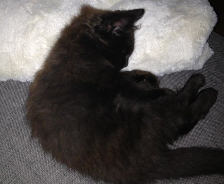 Katten er helt sort, men har enkelte grå hår i halen (kun mulig å se på svært nært hold).