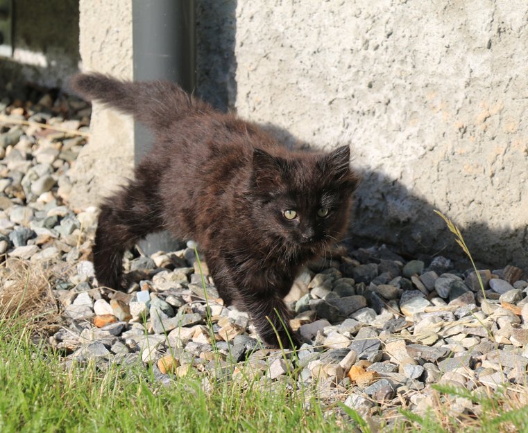 Mørk brun med en liten hvit flekk på halsen. Veldig sosial kattunge på fem måneder.