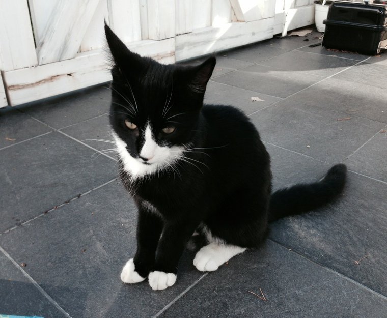 Kattungen rusler rundt i nabolaget her og pøver å finne mat. Ikke redd i det hele tatt og spaserer bare inn til folk.