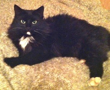Stor svart katt med hvite poter, bryst og hake. Rødt halsbånd med "my home" på der det står navn og tlf.nummer Han er litt sky, men veldig kosen.