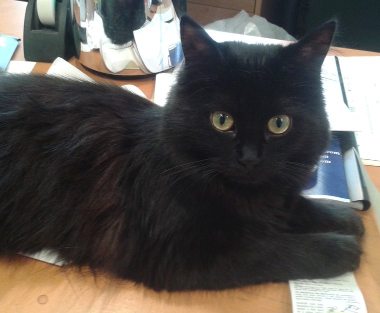Hun er en liten, semilanghåret katt med mørkebrun/sort pels. Halen er veldig stor og hårete. Hun har et blått halsbånd med telefonnummer. Er nyskjerrig og ikke særlig menneskesky.