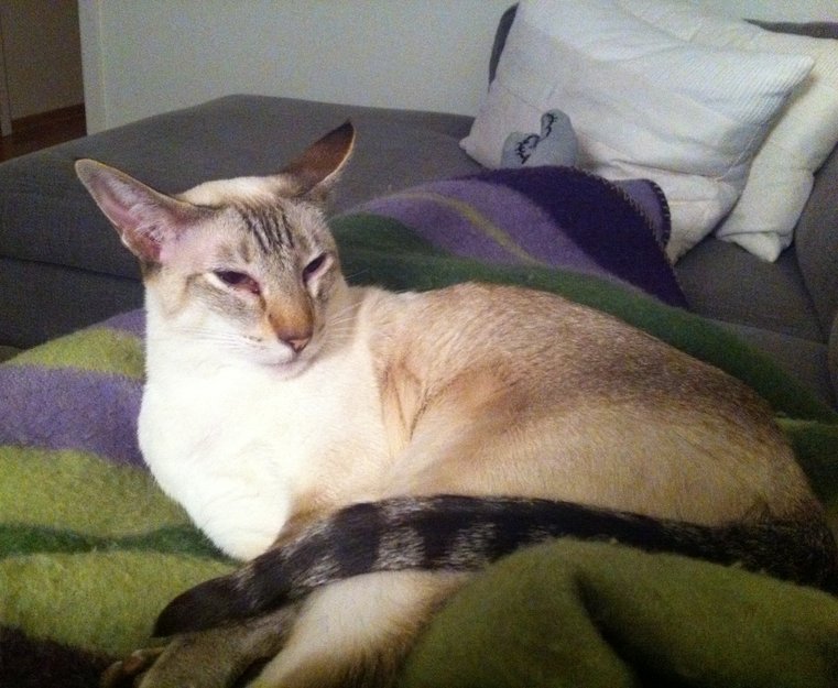 Ganske slank siameserkatt, 8 år gammel. Stripete i ansiktet, beigebrun på rygg og hvit på magen. Stripet på halen.