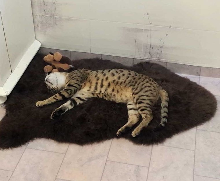 Slank katt med lange ben. Når han beveger seg kryper han mer langs bakken, og kan derfor se lavere ut enn han er. Lysebrun/beige farge med sorte leopardflekker over kroppen. Nedover hale og bein/lår har han svarte tigerstriper, svart haletipp. Hvit under haken, som dere kan se på bilde. Mørk rosa nese med brun nese rygg. Brune puter under alle potene.