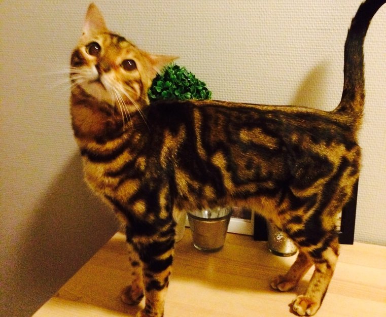 Bengal hannkatt, ukastrert. Marble mønster. Mellomstor, med lang kropp og høye bakbein.