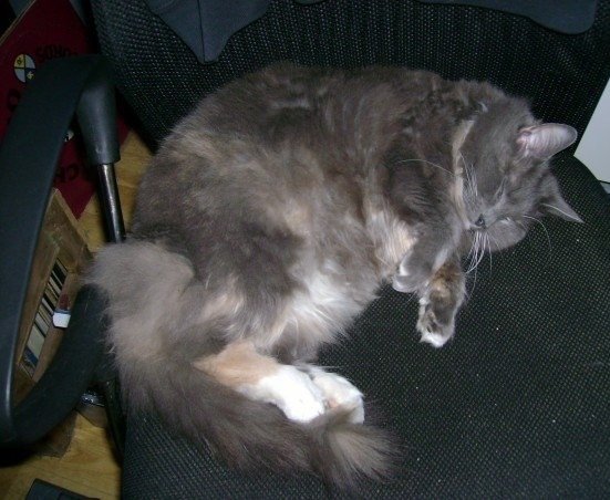 Katten er grå og har hvitt bryst og hvite sokker. Det er også noen oransje/beige flekker her og der - blant annet på høyre bakben og på et øre. Det er også mulig å se noe oransje-skjær på ryggen og magen, men dette syntes bare i det rette lyset. Den har en sort snute og en diger hvit bart.