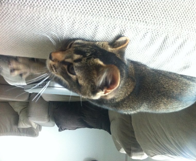 Kattungen har streifet i området i en par uker og det virket som han hadde bosatt seg ved busstoppet til Voksen Skog. Han var veldig oppmerksomhetsyk og var veldig sulten da vi ga ham mat. Vi tok ham med til veterinær, som kunne konstatere at han er 4mnd og i fin stand. Vi ga ham en ormekur og nå bor han hos oss og har det bra.
