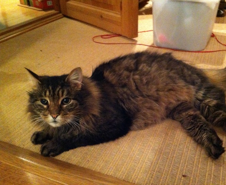 Ble oppringt av noen som hadde sett ham, og gikk dit hvor han var observert. Det var et godt stykke hjemmefra, så jeg var litt spent. Men da jeg kom dit og ropte på ham, så kom han løpende og mjauende med en eneste gang:-) Tynn var han blitt, men nå har han spist seg rund og god igjen:-) Hurra for pus i hus!