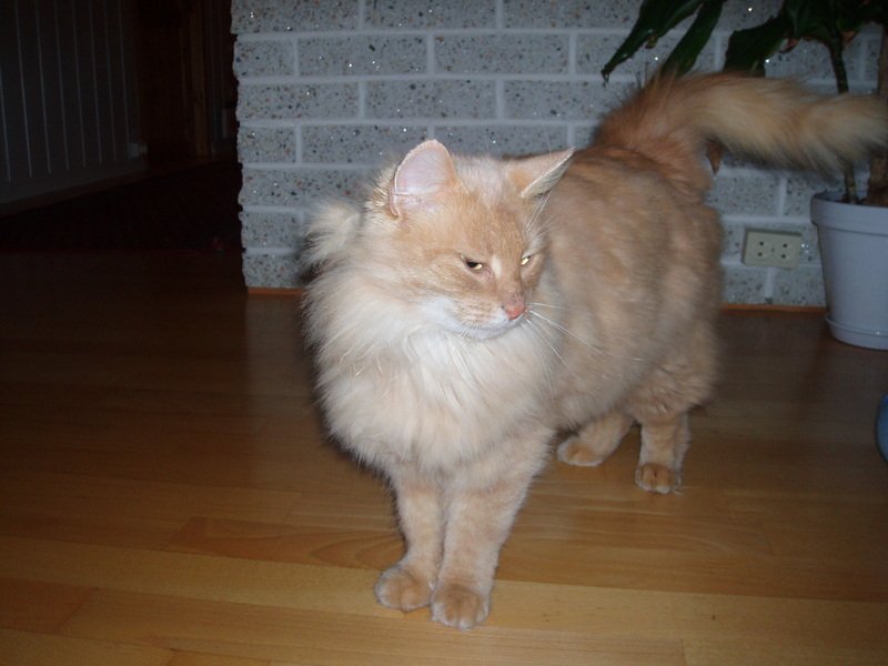 Snill og lydig pusekatt. Renslig og tydelig vant til mennesker. Kjærlig. Voksen. Grønne øyne.
