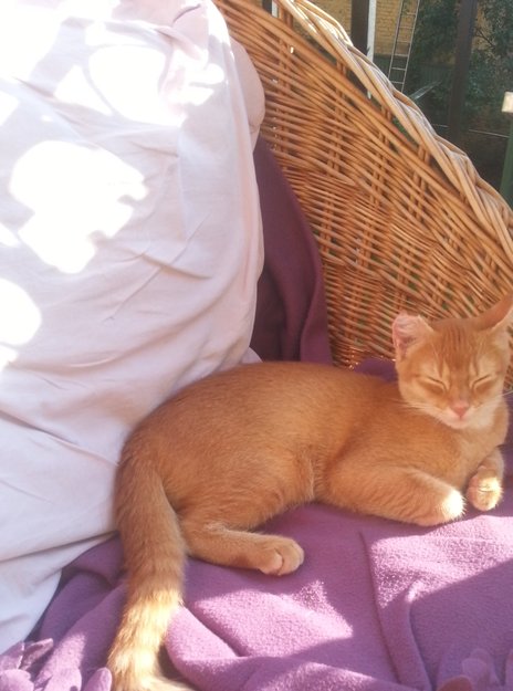 Lio er halvt abyssiner, halvt skogkatt. Han er rød, og litt hvitspraglete. Han er 5 måneder og tillitsfull.