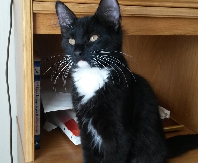 Svart med hvitt i brystet og hvite poter. 5 måneder. Sofus er ikke id-merket/chippet ennå.