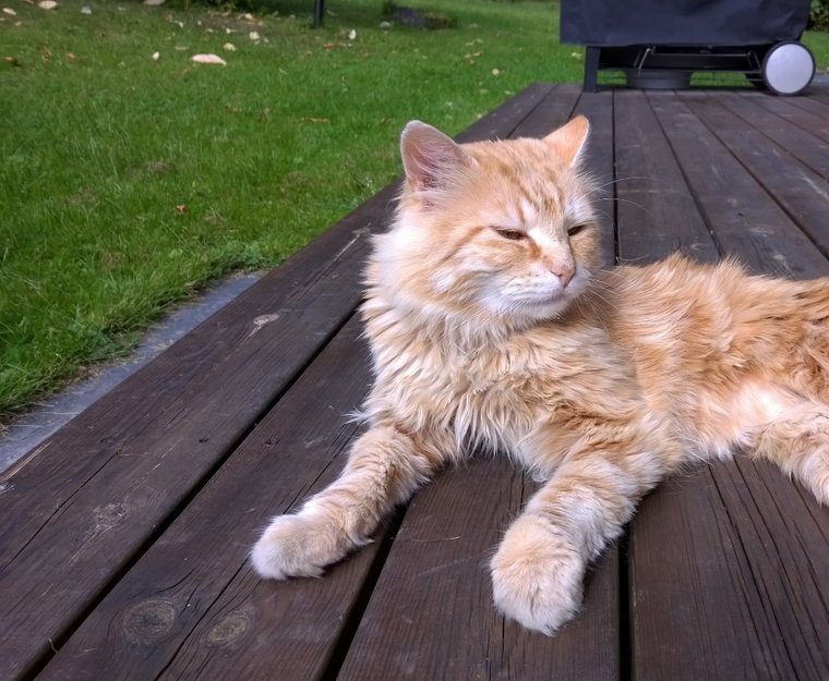 Dukket opp på verandaen og ble fort husvarm. Virket sulten og pjusk.