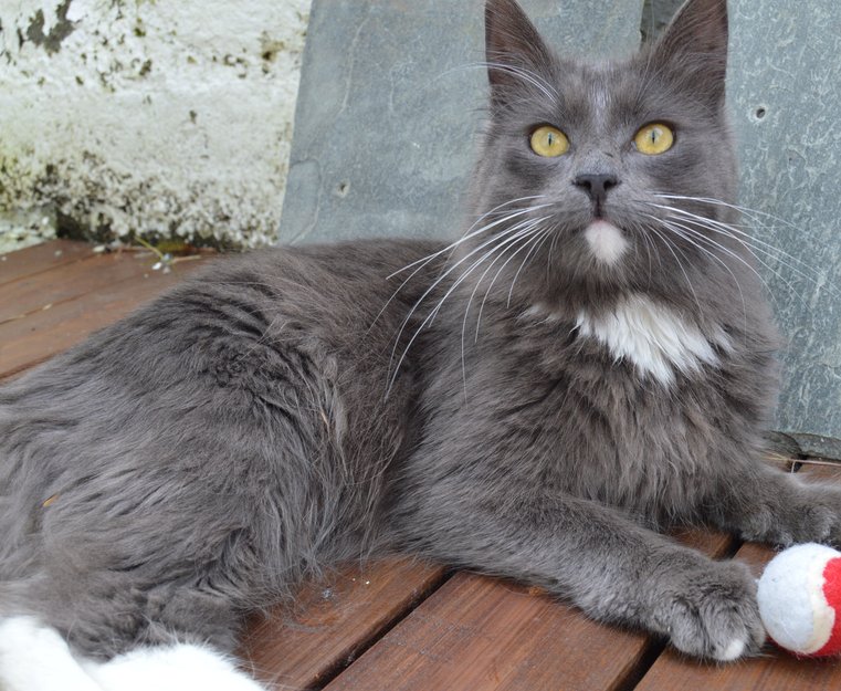 Slank, med lange bein og lang hale. Grå på mesteparten av kroppen, med et par hvite hår i panna, en liten hvit flekk under haka, en større hvit flekk på brystet og en stor en på magen. Han har hvite "sokker" på bakpotene og et par hvite tær på frampotene. Han er ganske langhåra, men har ikke så tykk pels. Ansiktet er ganske spisst og ørene er lange. Han er lite skvetten og veldig glad i folk (han oppsøker menneskelig kontakt, ikke bare hjemme).