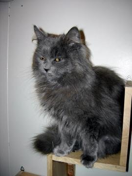 Helt grå, langhåret. Med en liten knekk helt innerst på halen.