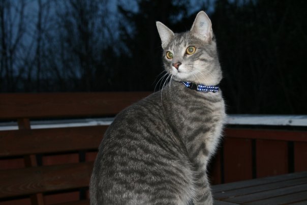 Grå og hvit stripet hankatt. slank, med lange lemmer. Når han forsvant hadde han på seg et blått halsbånd men vet ikke om dette er på lenger. han er en rolig katt som kan være litt skeptisk til fremmede.