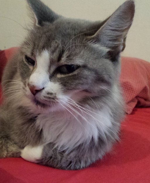 Hvit og grå langhåret hunkatt. Ble barbert på magen for noen dager siden, dette har ikke grodd ut ennå.