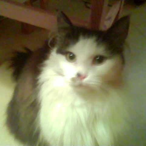 Hvit og sort langhåret. Hvit på undersiden. Sort rygg og sort hale. Sort flekk på snuten.