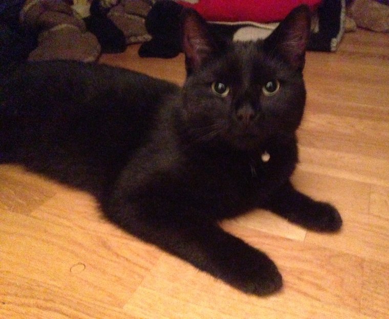 Hun er helsvart og semi korthåret. -foruten noen få hvite hår i halsgropen. Hun har et rødt halsbånd med bjelle på.