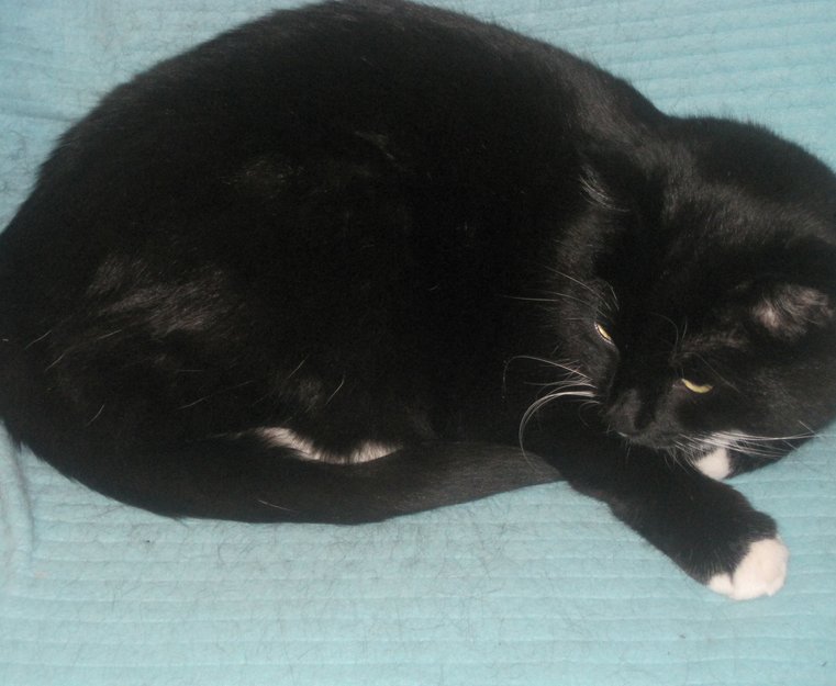 Hun er svart med hvite poter og hvit hals. Litt hvit på magen. Hun er merket.