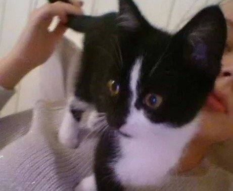 Sort og hvit kattunge med sort nese og en hvit stripe over panna. 4 hvite ben. Hvit i brystet.