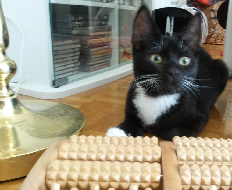 Søt katt. Liten og nett. Kanskje kun 5-6 måneder(?) Slank. Svart med hvite poter og litt hvitt i brystet. Litt brunt skjær i pelsen. Svakt stripete. Det er en veldig fin katt. Han maler høyt og "prater". Leken, kvikk og spretten. Og han er veldig kontaktsøkende, tillitsfull, kosete og kjælen, så vi tenker at noen må savne denne sjarmøren. Om han ikke er din, men du mener du har informasjon, vær så snill å ta kontakt. Spesielt kjennetegn er at han har ekstra tær på forpotene.